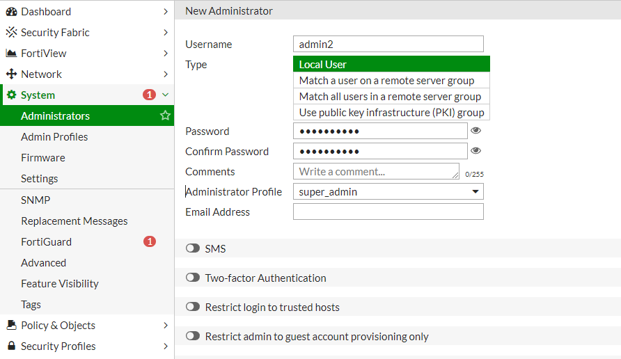 먼저 기본적으로 fortigate에는 admin이라는 계정이 만들어져 있다.