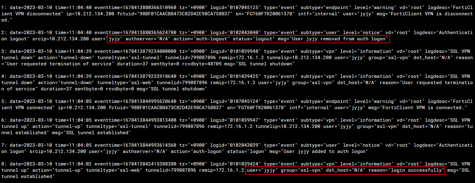 fortigate ssl-vpn user login 및 logout 정보 CLI에서 확인하는 방법