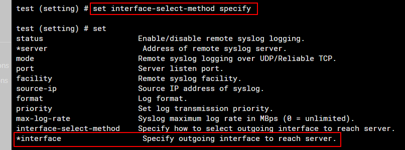 해당 설정을 specify로 바꿔주면 보이지 않던 interface 부분이 보이게 되는데 syslog server가 연결되어 있는 Interface를 지정해 주면 됩니다.