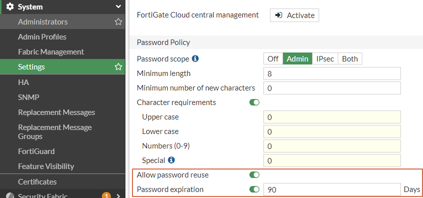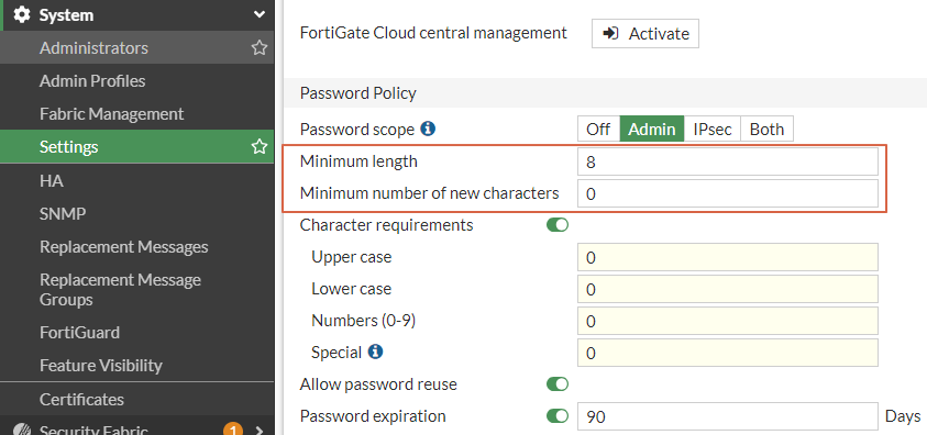 Fortigate admin password policy 설정 방법