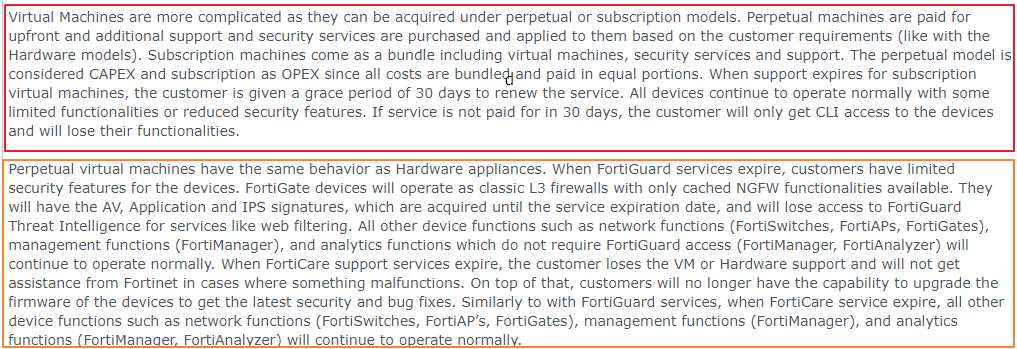 explain what happens to the devices when FortiGuard, FortiCare or both services expire.ScopeFortiGate, FortiManager, FortiAnalyzer, FortiSwitch, FortiAPSolution Most of the Fortinet products come in multiple form factors: Hardware, Virtual Machine (for pri