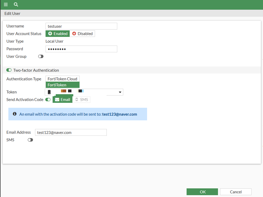 먼저 계정에 FortiToken을 할당시켜주고 Email을 설정해 줍니다.