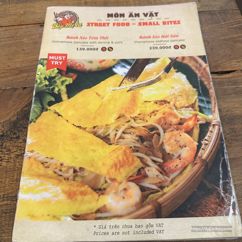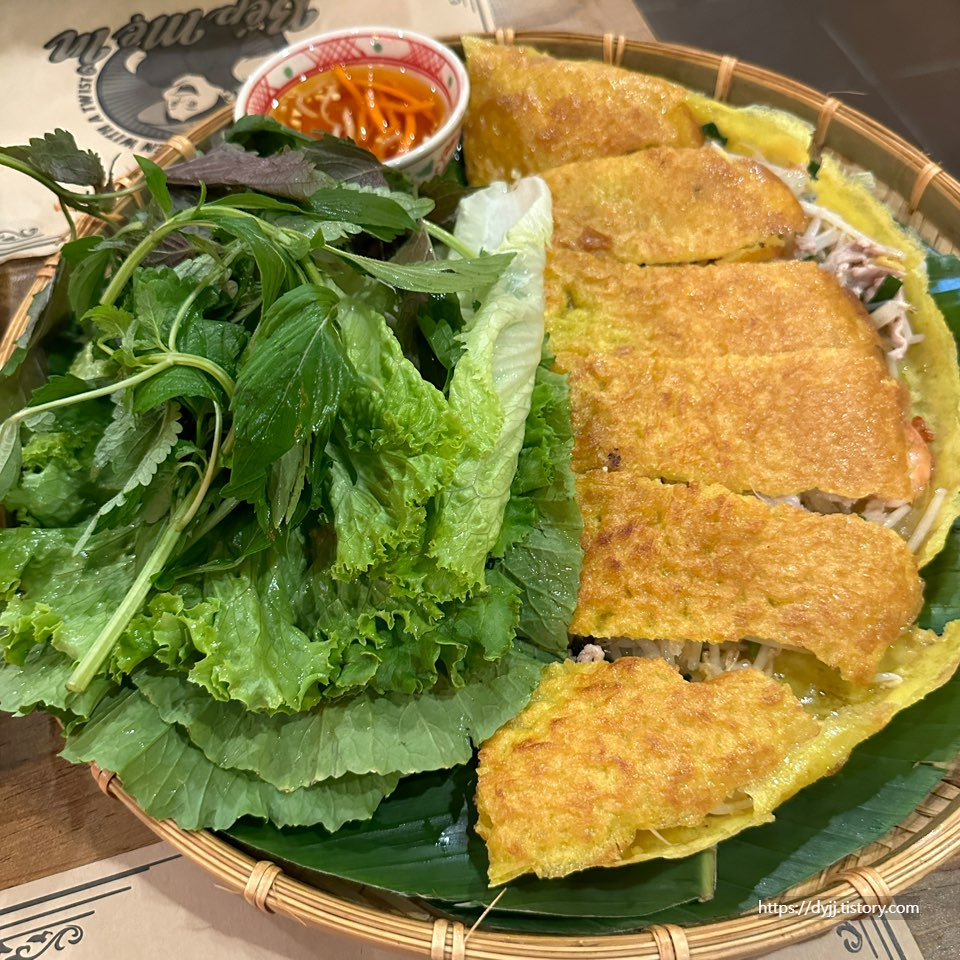 베트남식 부침개로 겉에는 바삭하게 튀기고 안에는 새우와 돼지고기 야채가 듬뿍 들어가 있어요