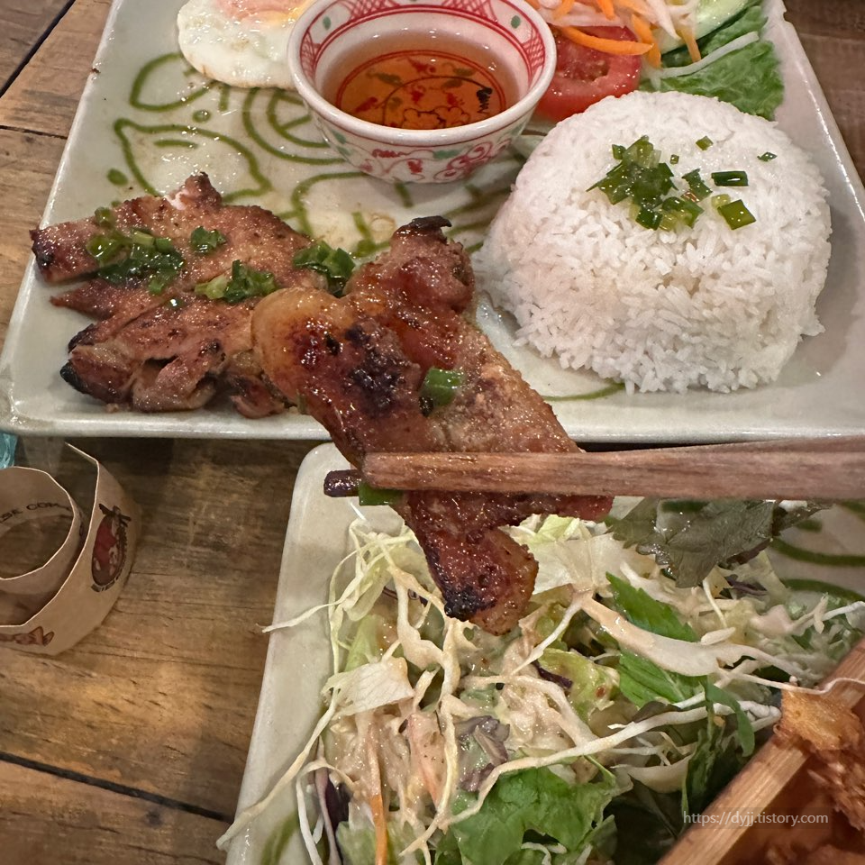 저는 반쎄오 고기덮밥?이랑 닭튀김같이 보이는 메뉴 주문했어요