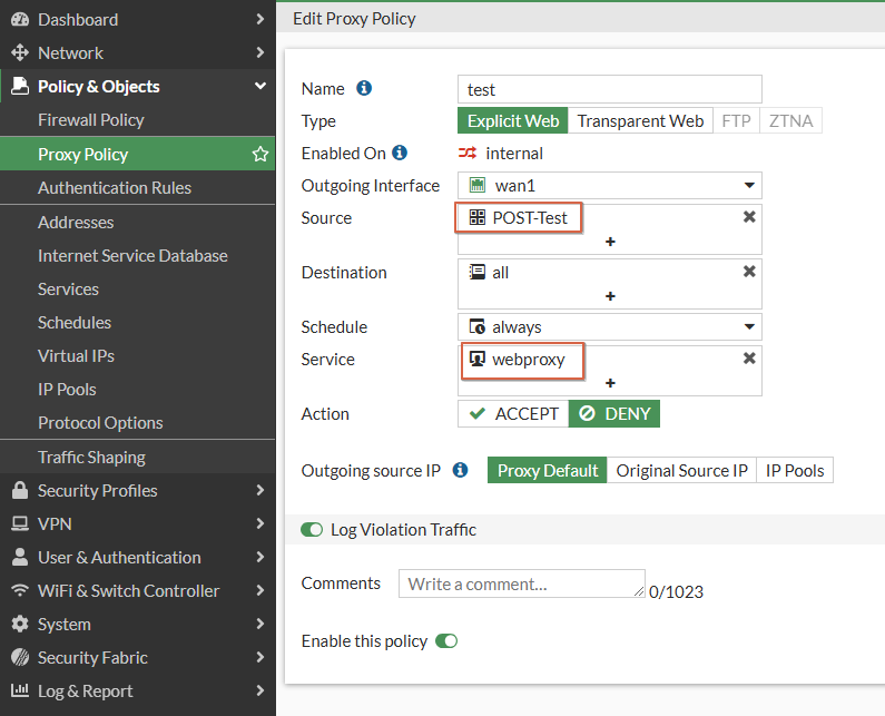 정책 생성 시 클라이언트 Post 요청은 전부 차단 / Proxy Address의 Soucre ALL