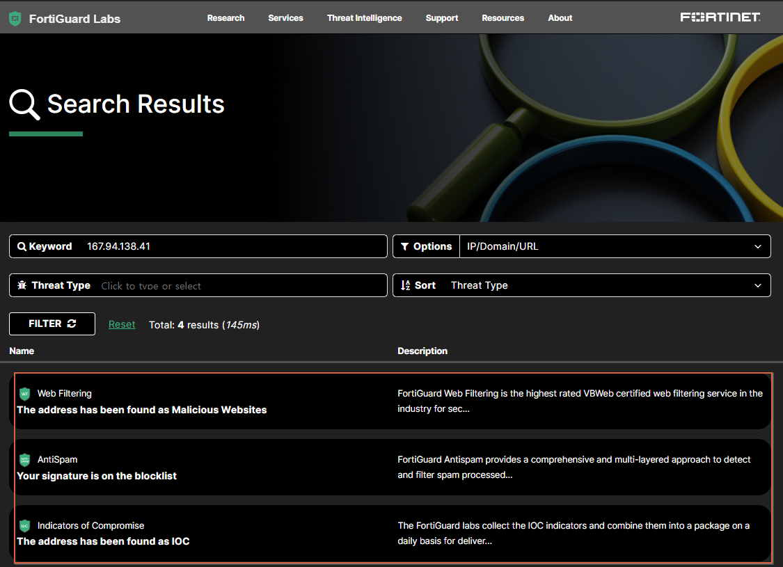 https://www.fortiguard.com/search?q=<IP address>&engine=7 / 예시 IP 167.94.138.41
