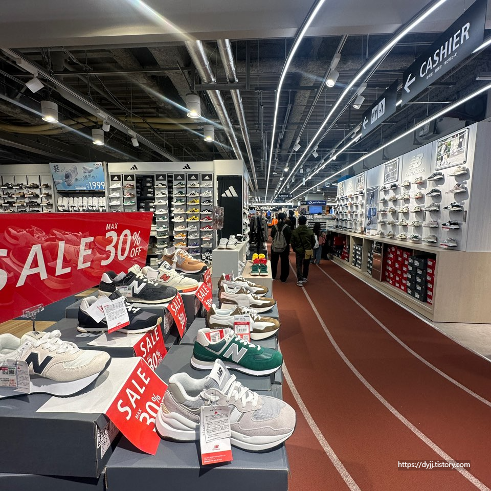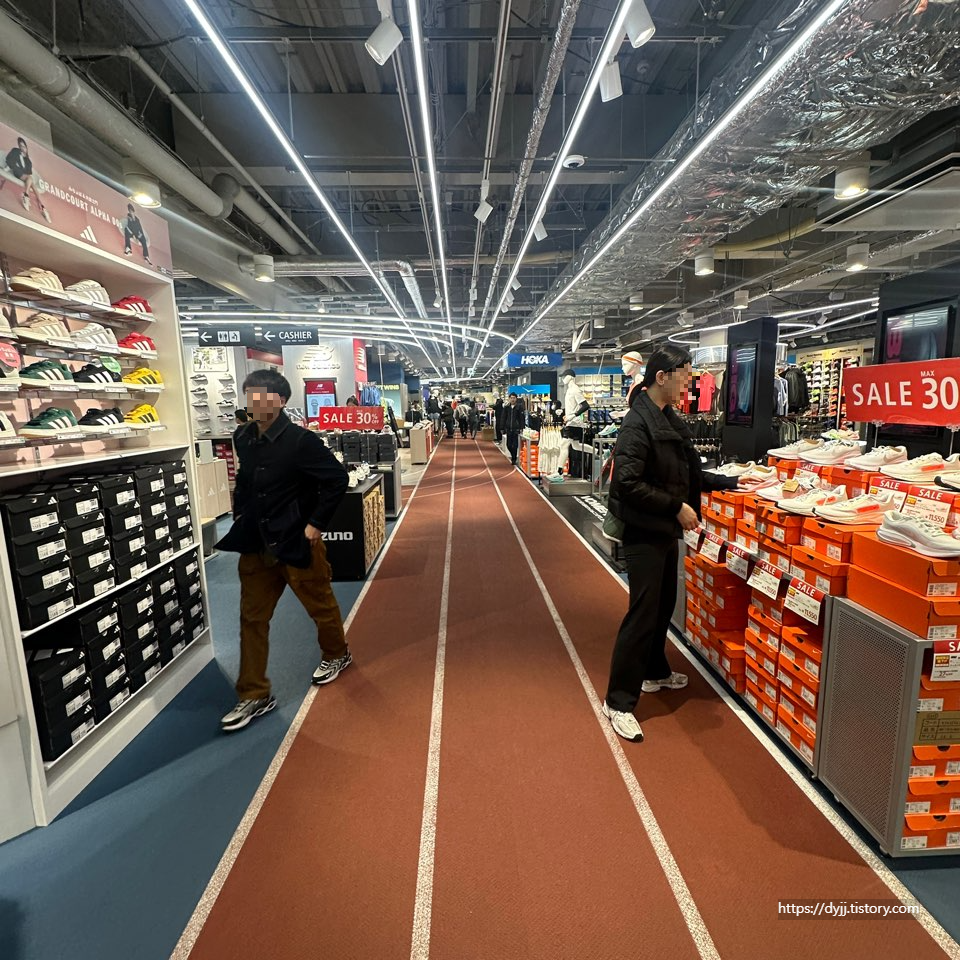 스포츠 매장 용품답게 바닥도 트랙감성으로 만들어져 있습니다