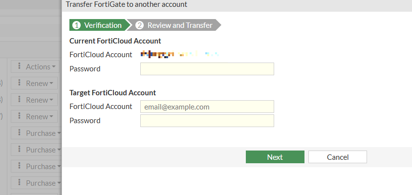 이전할 계정의 FortiCloud 계정 및 비밀번호 입력