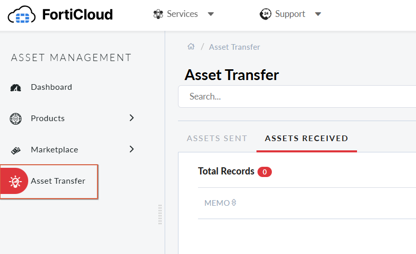 Forticloud 접속 후 상단의 Services > ASSET MANAGEMENT > Asset Transfer