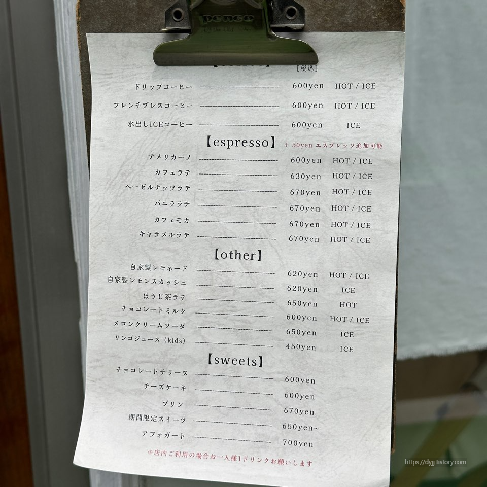 드립, 콜드브루등 여러 가지 메뉴들이 제공되고 600엔정도의 가격대로 형성되어 있습니다