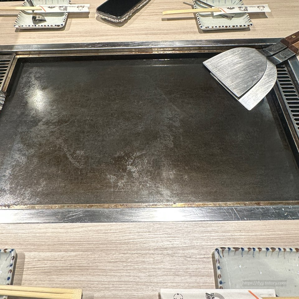 테이블마다 큼지막하게 있는 몬자야끼 철판