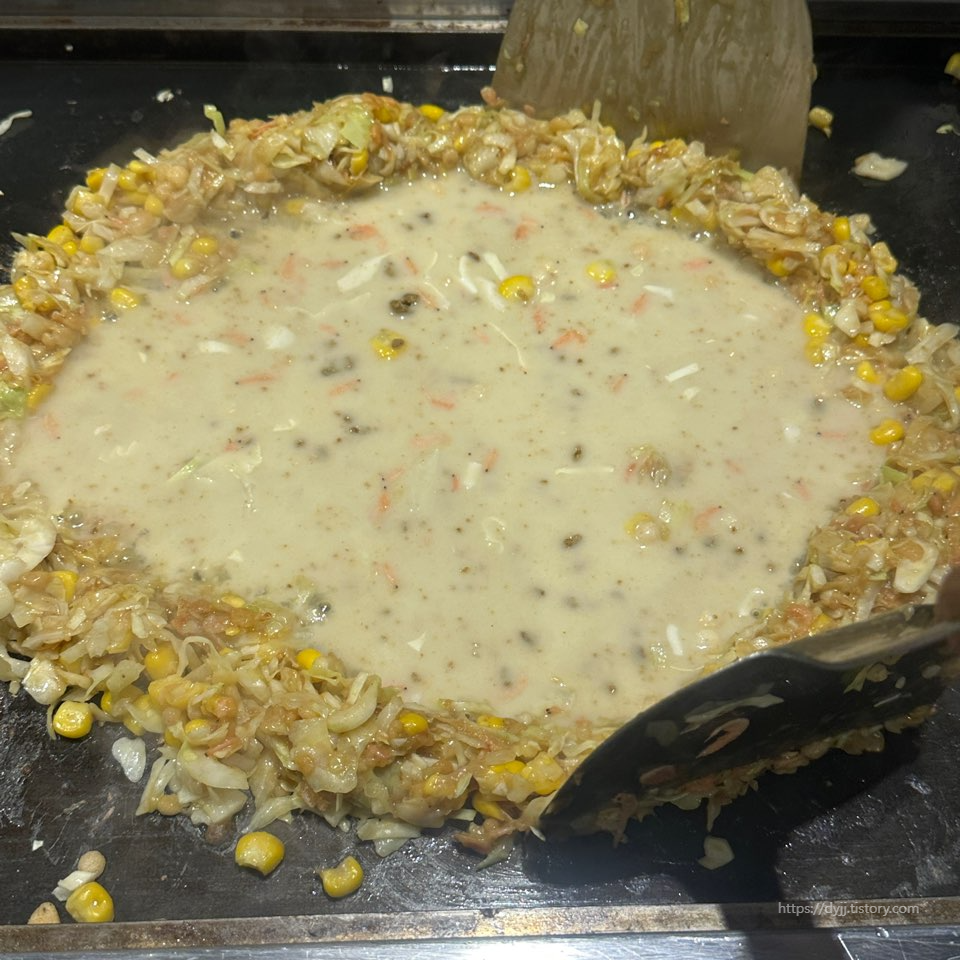 일본여행에서 먹어봐야 하는 음식 중 하나인 몬자야끼, 몬자야끼는 도쿄지역에서 유래된 철판 요리로 밀가루 반죽을 얇게 부어 야채,해산물,튀김 부스러기등을 함께 볶아 먹는 일본 요리입니