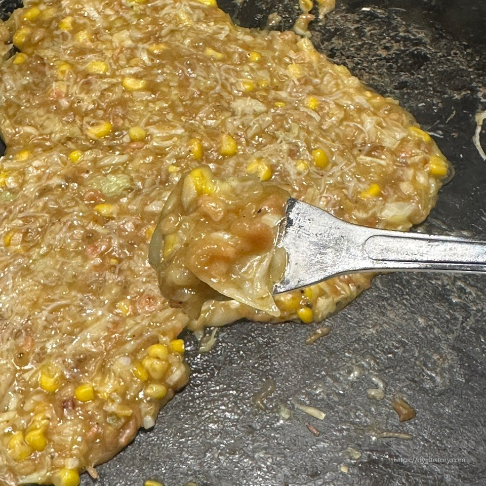 그리고 몬자야끼 위에 토핑과 안에 반죽이 있습니다
