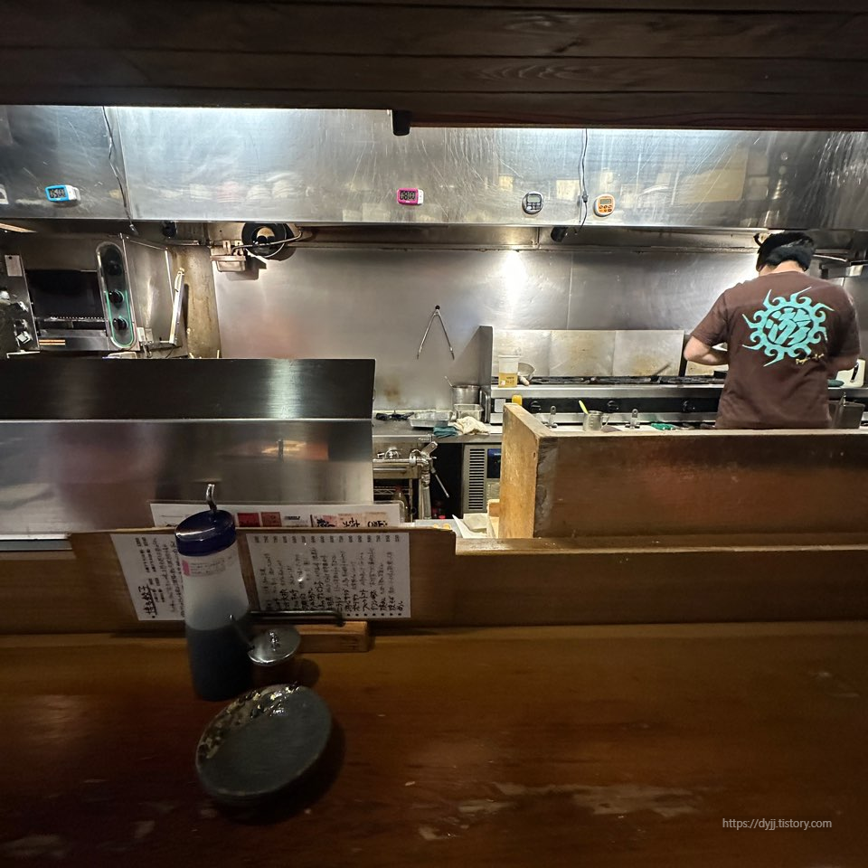 내부는 살짝 어두운 분위기였어요 중간중간 조명이 있고 오픈 주방에 테이블, 다찌석까지 꽤 큰 규모