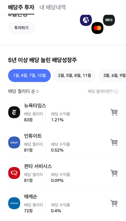 배당내역 말고 배당주 투자 탭을 들어가 보면 배당주들 확인도 가능합니다.